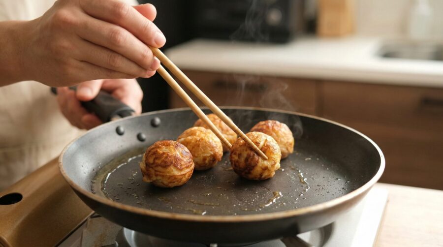 その理由はシンプル。銀だこはお店で「鉄板(フライパンのようなもの)+油」で焼いて仕上げています。つまり、フライパンで温め直すことは、お店の調理法を自宅で再現することに他なりません。火加減を自由にコントロールでき、油で表面をカリッと仕上げられるフライパンこそ、最強の温め直しツールなのです。