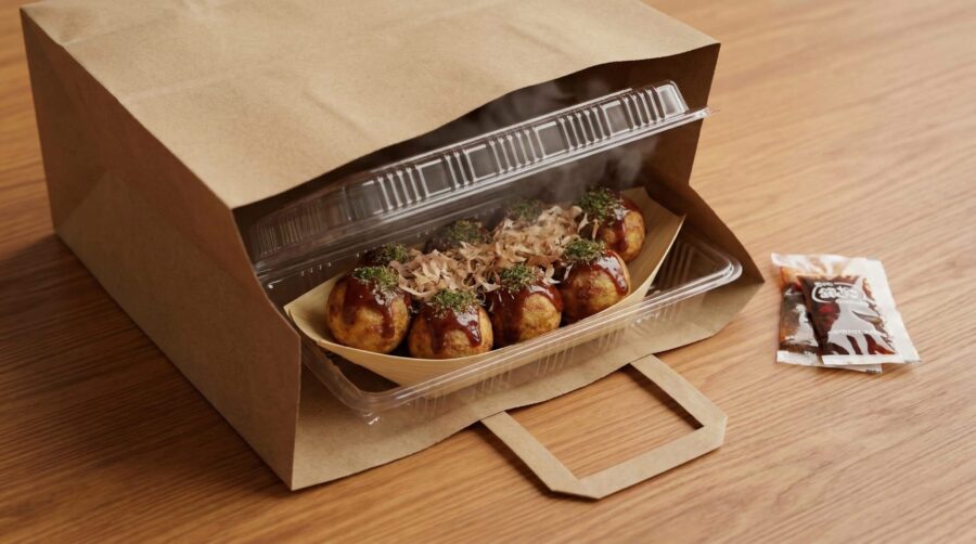 - ソース・マヨネーズは別袋でもらう — ソースの水分がたこ焼きを湿らせるのを防ぎ、カリカリ持続時間が伸びます