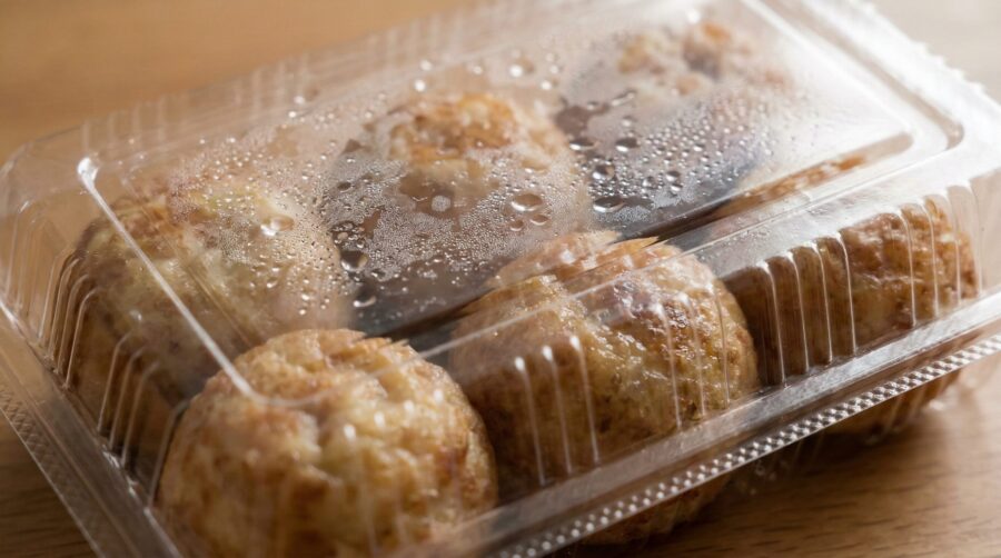 ところが、たこ焼きが冷めていく過程で、中のトロトロ生地に含まれる水分が表面に移動してきます。さらに、テイクアウトの容器は蓋が閉じられているため、たこ焼きから出る蒸気が容器内にこもり、その水蒸気がたこ焼きの表面に結露。せっかくのカリカリ層が水分を吸って、あの「べちゃべちゃ」状態になってしまうのです。