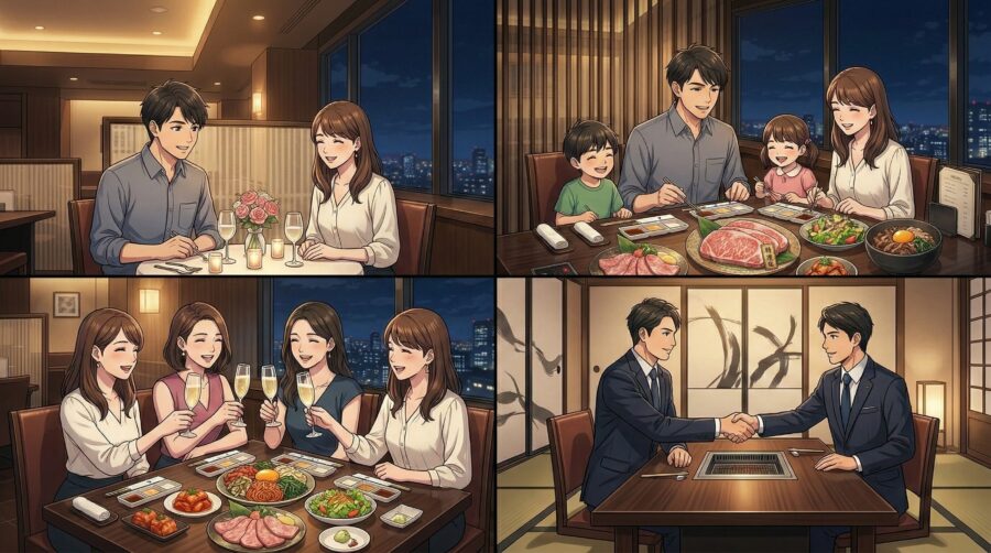 叙々苑は利用シーンによって最適な予算やメニューの選び方が異なります。ここではデート・家族・女子会・接待の4つのシーンに分けて、具体的な注文プラン例とともに解説します。