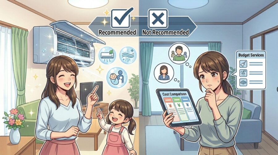 ネットで検索すると「ひどい」「やばい」といったネガティブなワードが目に入り、申し込みを迷ってしまう方も多いはずです。私自身も数年前、子どもがアレルギーになったことをきっかけにエアコンクリーニングを検討し、同じように口コミを調べ回った経験があります。