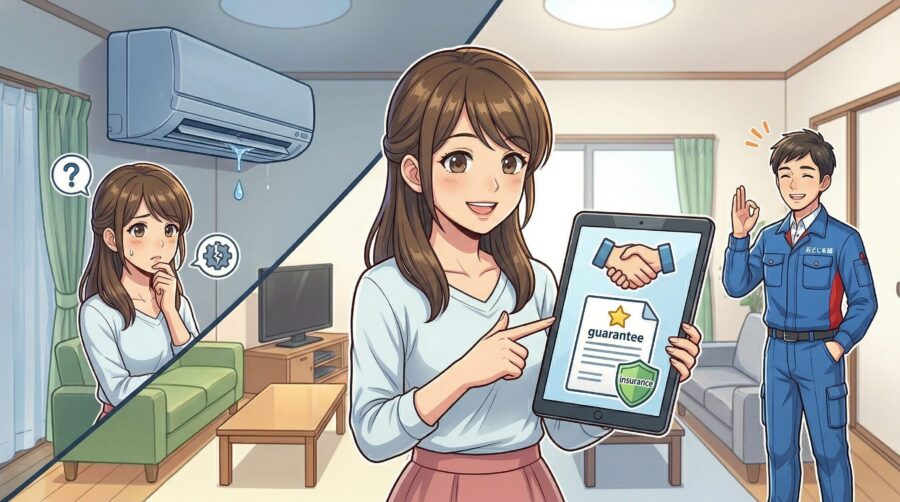 作業後に異常(水漏れ・異音・冷暖房不良など)が発生した場合は、すぐに担当店舗に連絡してください。ほとんどのケースで再訪・再作業に対応してもらえます。