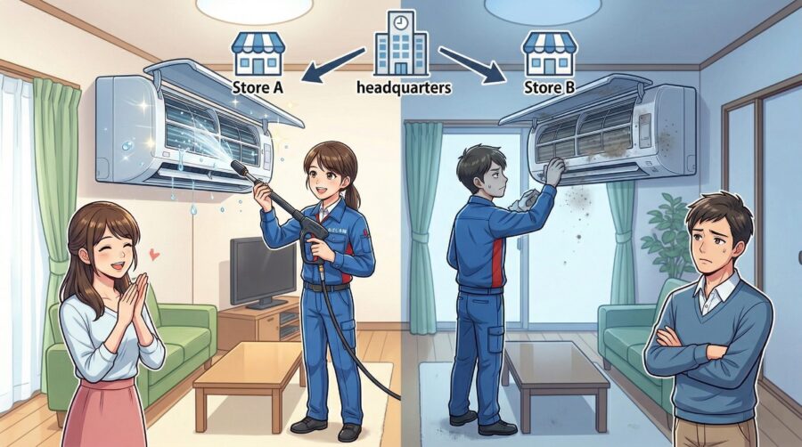 ここが本記事の核心です。なぜおそうじ本舗の評判は「神対応だった」「ひどかった」と両極端に分かれるのでしょうか?その答えは「フランチャイズ制」にあります。