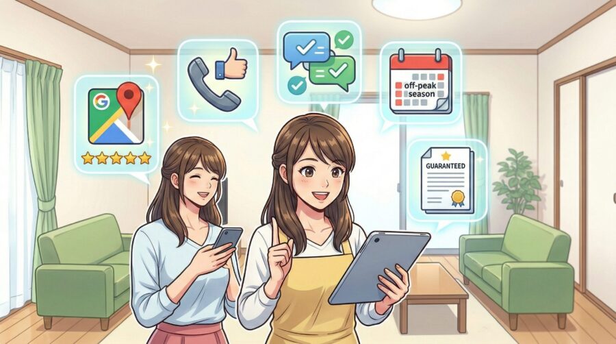 閑散期(9〜11月・2〜3月)に依頼することで、作業の丁寧さが上がり、料金も割安になりやすいです。夏前(5〜8月)は予約が殺到し技術者1人当たりの件数が増えるため、1件あたりの丁寧さが低下します。悪い口コミの多くが「夏場」に集中しているのはこのためです。